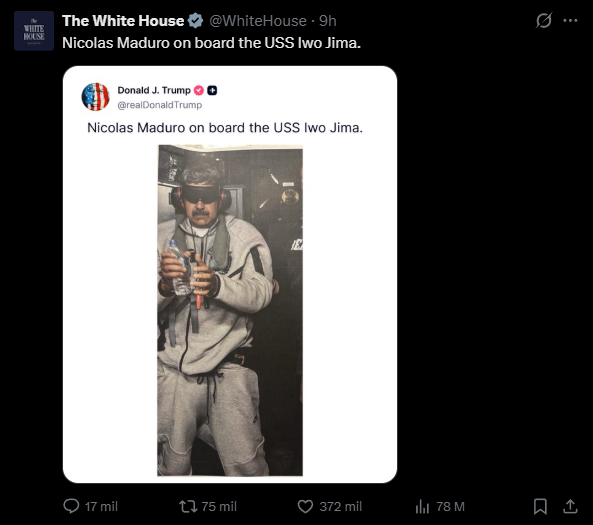 En redes sociales, el presidente de Estados Unidos, Donald Trump, difundió directamente la primera imagen oficial de Nicolás Maduro tras su captura, publicándola en su plataforma Truth Social y replicada también por la Casa Blanca en X con la descripción “Nicolás Maduro a bordo del USS Iwo Jima”. La fotografía muestra al líder venezolano esposado, lo que generó una intensa viralización y debate en diversas plataformas entre quienes la consideran la primera confirmación visual del arresto y quienes advierten sobre posibles manipulaciones de otras imágenes circulantes. La publicación de Trump intensificó aún más la discusión pública sobre la legitimidad de la acción militar y su impacto en la crisis venezolana.