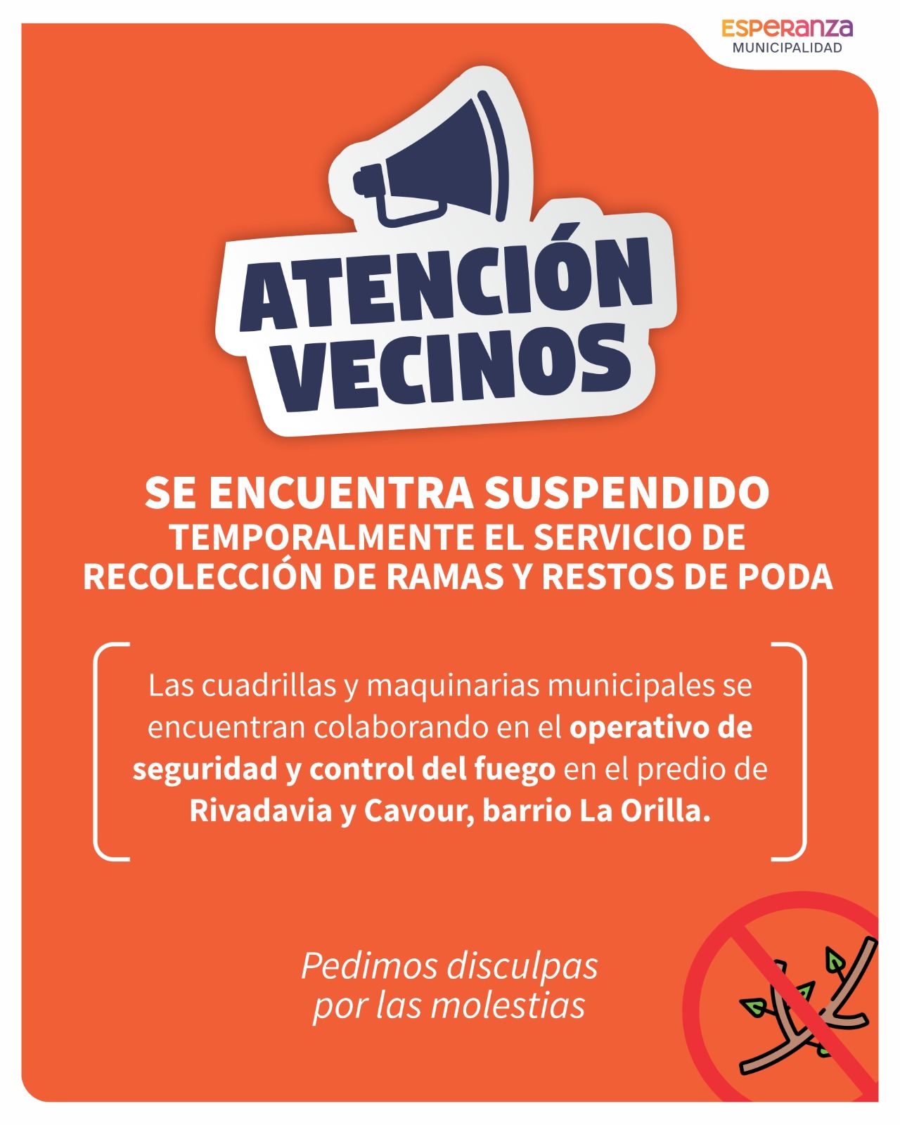 La Municipalidad informó a través de sus redes sociales que el servicio de recolección de ramas y restos de poda permanecerá suspendido hasta nuevo aviso. La medida se debe a que las cuadrillas y maquinarias municipales están afectadas al operativo de seguridad y control del incendio en el predio de Rivadavia y Cavour, priorizando la colaboración en las tareas de emergencia.