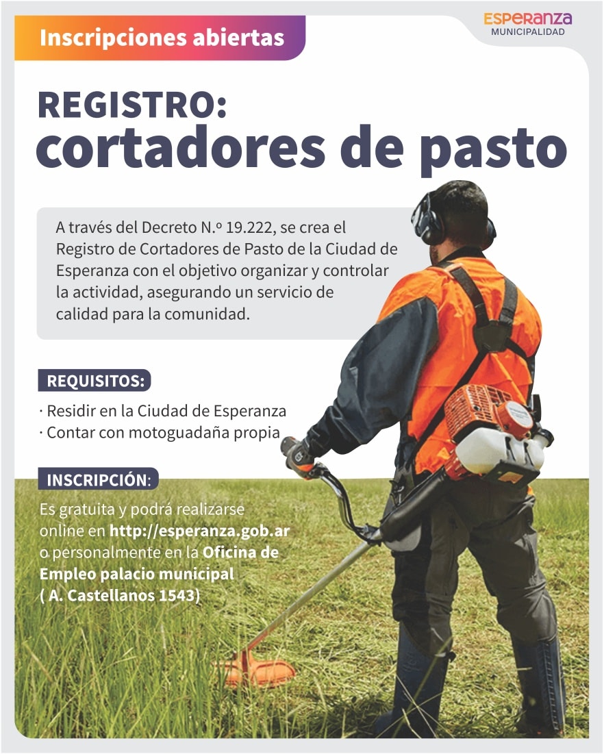 El registro es gratuito y está abierto a personas que cumplan con los siguientes requisitos: residir en la ciudad de Esperanza y contar con motoguadaña propia.