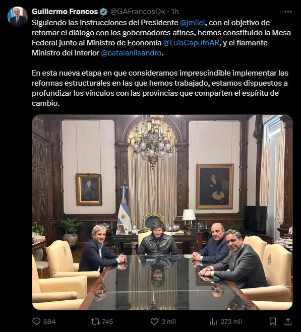 Fue realizado por el jefe de Gabinete, Guillermo Francos, a través de sus redes sociales, destacando que “siguiendo las instrucciones del presidente, Javier Milei, con el objetivo de retomar el diálogo con los gobernadores afines, hemos constituido la Mesa Federal junto al ministro de Economía Luis Caputo y el flamante ministro del Interior Lisandro Catalán”.