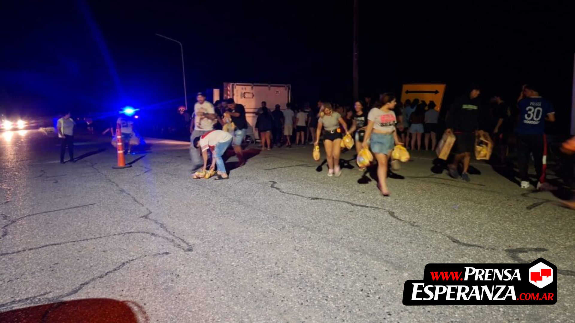 Un camión que transportaba 48 pales de pollos congelados volcó sobre la banquina de la Ruta Provincial 4, muy cerca del cruce con la Ruta 2, y terminó siendo blanco de un masivo saqueo protagonizado por más de 300 personas.