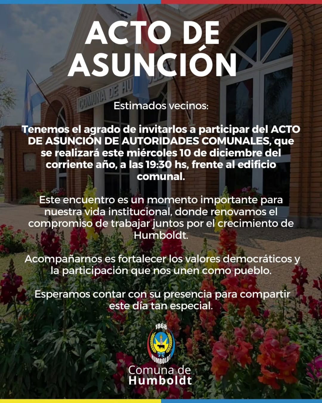 La Comuna de Humboldt invita a toda la comunidad a participar del Acto de Asunción de Autoridades correspondiente al período 2025–2027.